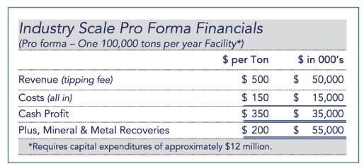 What is particularly noteworthy is the economics of this recycling business. For context, Comstock’s market capitalization is currently $227 million. The capex for building and launching a single recycling plant is $12 million. We can get an idea of the economics of operating a single plant from their investor materials.