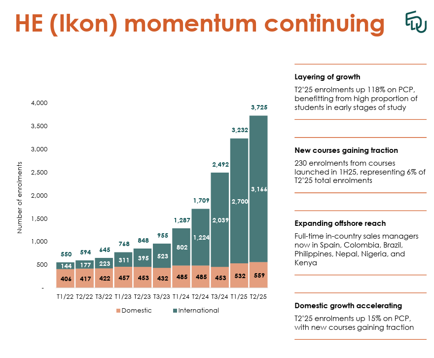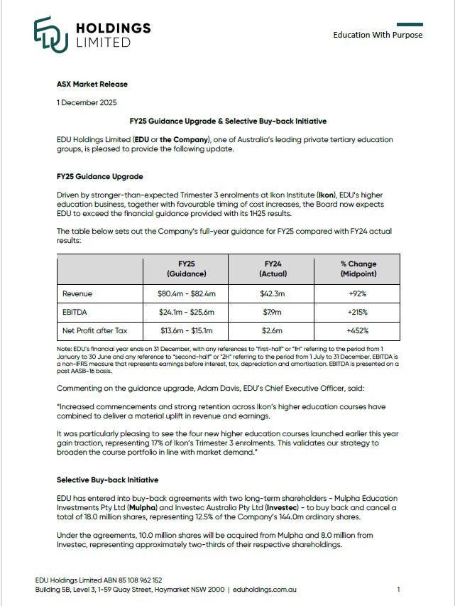 Not long ago, Floebertus introduced Cedergrenska, a private school operator in Sweden, on his blog. In the end, I decided not to buy the shares due to the potential risk of a change of government in Sweden and possible pressure on the company’s margins, which is highly dependent on state funding and on which I was unable to form a strong opinion. I noticed that there are also cheap companies in the education sector in Australia, but none of them caught my attention. If you are interested, take a look at companies such as Embark Early Education or Nido Education. Recently, however, I came across Australian investor Jeremy Raper on X. At the beginning of the year, Jeremy noticed that the Australian company Edu Holdings Limited attempted to buy out minority shareholders and delist from the stock exchange. This was a signal to him that something was changing in the company, and indeed it did. The company reported massive growth in revenue, profit, and margins thanks to its IKON educational programs, especially for foreigners, and the stock price followed suit. The best time to buy was for most of last year, but in my opinion, the second-best time is right now, because the company is still very cheaply priced, is doing massive buybacks, and will continue to grow at a decent pace in 2026.